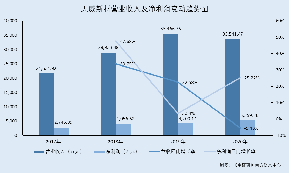 据签署日期为2021年7月23日的招股书(以下简称“招股书”)及签署日期为2021年2月26日的招股书(以下简称“2月版招股书”),2017-2020年,天威新材的营业收入分别为2.16亿元、2.89亿元、3.55亿元、3.35亿元,2018-2020年分别同比增长33.75%、22.58%、-5.43%。