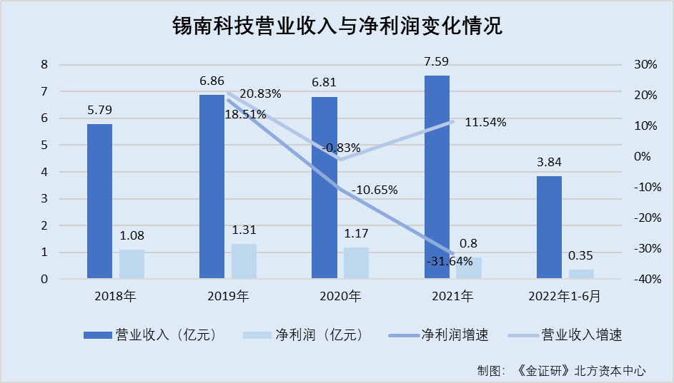 据招股书及锡南科技签署于2021年11月5日的招股说明书(以下简称“2021年招股书”),2018-2021年及2022年1-6月,锡南科技的营业收入分别为5.79亿元、6.86亿元、6.81亿元、7.59亿元、3.84亿元。同期,锡南科技的净利润分别为1.08亿元、1.31亿元、1.17亿元、0.8亿元、0.35亿元。
