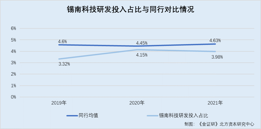 根据《金证研》北方资本中心研究,2019-2021年,锡南科技同行可比企业研发投入占营业收入比例的均值分别为4.6%、4.45%、4.63%,,分别高于锡南科技1.28个百分点、0.3个百分点、0.65个百分点。