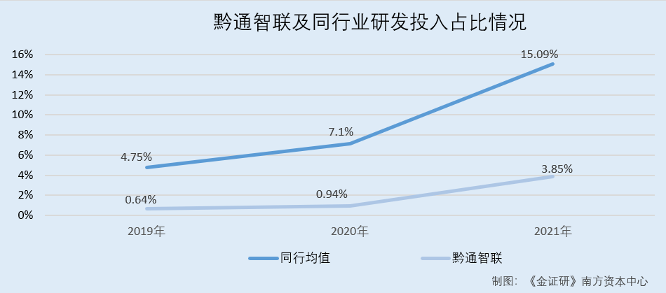 根据《金证研》南方资本中心测算,黔通智联同行可比公司研发投入占比均值为4.75%、7.1%、15.09%。
