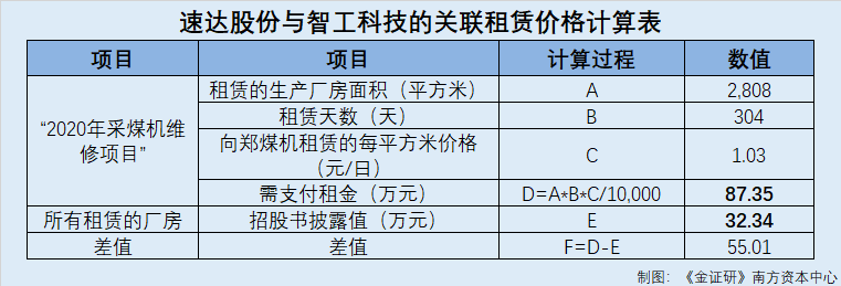 即是说,即使速达股份与智工科技的租约从2020年3月3日开始计算,租赁面积也仅计算“2020年采煤机项目”所租赁的厂房,不考虑速达股份向智工科技转租的办公室、其他项目存在的租赁厂房的情况下,速达股份或需向郑煤机支付的“2020年采煤机项目”的厂房租金,高于当年智工科技向速达股份支付的所有厂房租金,其差值为55.01万元。