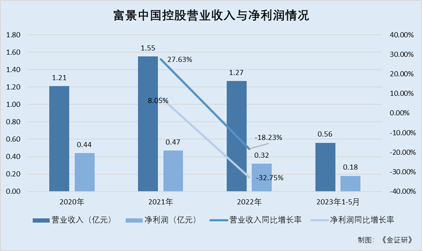 业绩方面,招股书显示,2020-2022年及2023年1-5月,富景中国控股的营业收入分别为1.21亿元、1.55亿元、1.27亿元、0.56亿元,2021-2022年分别同比增长27.63%、-18.23%。