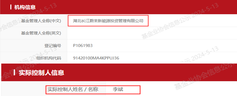 然而,据证券投资基金业协会公示信息,截至查询日2024年5月28日,长江蔚来投资的实际控制人为李斌。