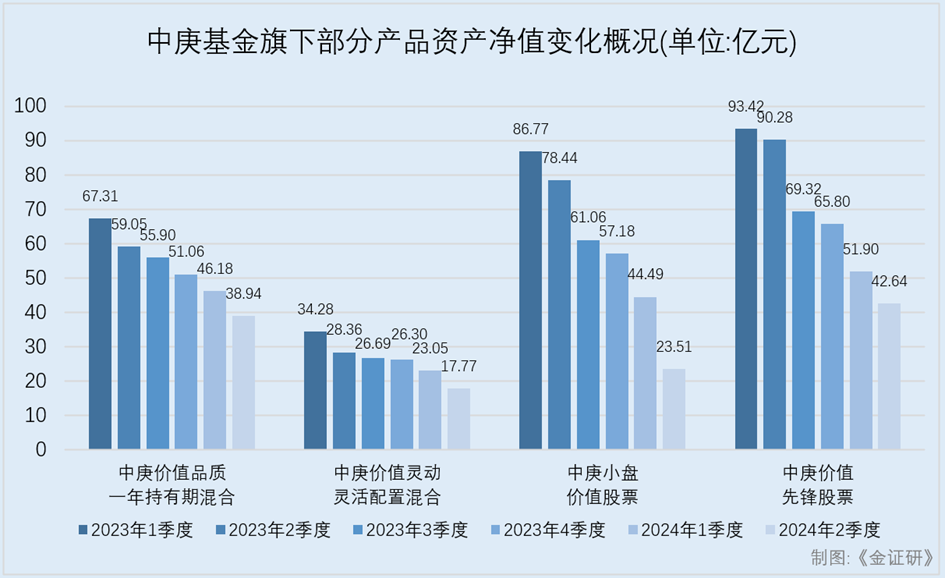 然而,自2023年一季度末以来,中庚基金旗下所有基金整体的资产净值持续下滑。