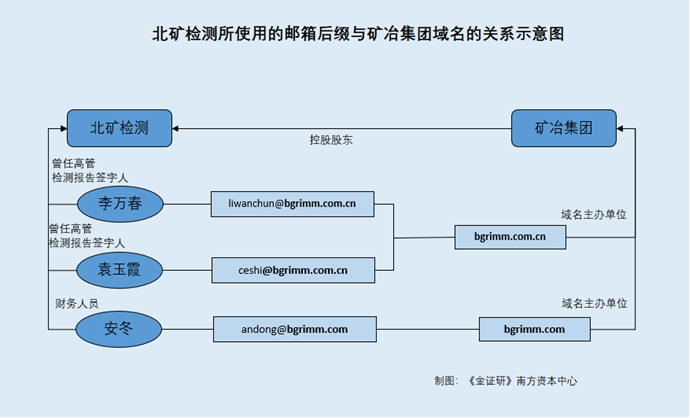 简言之,北矿检测原高管李万春退休后,被北矿检测返聘为技术顾问。而李万春所用邮箱的邮箱后缀,与北矿检测控股股东矿冶集团持有的网站域名相同。同时,北矿检测财务人员安冬所用邮箱的邮箱后缀,又与矿冶集团持有的另一网站域名相同。且北矿检测的联系人为袁玉霞,其使用的联系邮箱后缀,也与持有的网站域名一致。