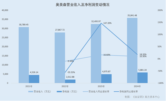 2022-2024年,奥美森的营业收入分别同比增长-9.49%、16.6%、10.3%,净利润分别同比增长-55.53%、147.2%、18.2%。
