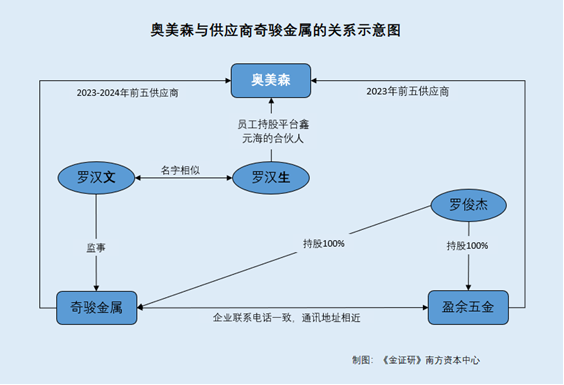 据签署于2025年9月19日的招股书,2023年,中山市三乡镇盈余五金加工厂(以下简称“盈余五金”)及中山奇骏金属制品有限公司(以下简称“奇骏金属”)为奥美森第三大供应商,奥美森对两者的采购金额合计为353.88万元。2024年,奇骏金属为奥美森第三大供应商,奥美森对其采购金额为481.25万元。