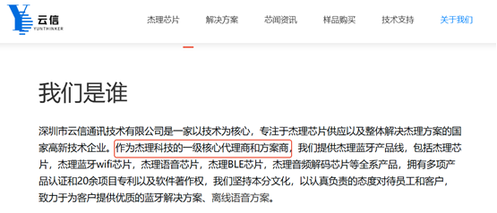 基于上述情形,深圳云信和杰理科技的“联系”或可见一斑,其在官网也自称系杰理科技的代理商。