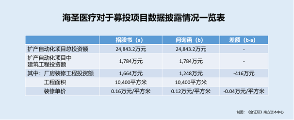 经测算,对于“扩产自动化项目”的厂房装修工程总投资额数据,海圣医疗招股书披露的数据比在二轮问询回复披露的数据多416万元。