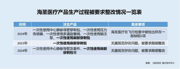 由上可知,海圣医疗的产品“一次性使用麻醉穿刺包”的核心工序包括“灭菌及EO解析”。而回溯历史,2019年,在飞行检查中,海圣医疗的企业生产管理体系存在5项一般缺陷,检查产品包括一次性使用麻醉穿刺包。2023-2024年,海圣医疗的“一次性使用麻醉穿刺包”产品连续两年的无菌规范遭限期整改。