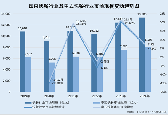 2019-2024年,国内快餐市场规模分别为10,810亿元、9,201亿元、10,982亿元、10,312亿元、12,439亿元、13,300亿元。同期,国内中式快餐市场规模分别为6,167亿元、5,296亿元、6,338亿元、6,184亿元、7,532亿元、8,097亿元。