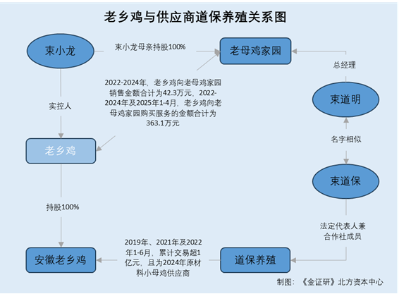 也就是说,2019年、2021年及2022年1-6月,老乡鸡全资子公司安徽老乡鸡向道保养殖累计采购超亿元,且道保养殖系彼时安徽老乡鸡前五大供应商中唯一合作社性质企业。此外,2024年,道保养殖仍为安徽老乡鸡原材料小母鸡供应商。值得注意的是,老乡鸡实控人束小龙母亲张琼控制的老母鸡家园与老乡鸡存在关联交易,且老母鸡家园的总经理“束道明”,与老乡鸡供应商道保养殖的法定代表人兼成员之一的“束道保”名字相似,关系或待解。