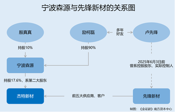总的来看,截至发行前,宁波森源持有杰特新材17.6%的股权,系杰特新材的第二大股东,宁波森源的控股股东系励柯磊。值得一提的是,奈伦农业曾因股权代持起诉宁波森源,称股权代持的存续与先锋新材为其他公司担保有关。在宁波森源入股杰特新材背后,励柯磊关联公司与卢先锋关联公司之间存在频繁的资金往来。2025年6月,卢先锋丧失对先锋新材的控制权。