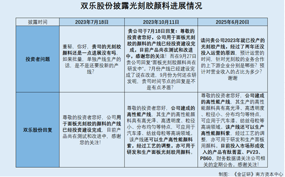 值得注意的是,上市前,双乐股份披露其研究成果已包含可用于光刻胶领域的产品,上市后,双乐股份曾称用于光刻胶的颜料尚在研发中。且双乐股份2023年称面板光刻胶的颜料的产线已建成,2024年称面板用光刻胶颜料尚在研发改进中,信披或现疑云。
