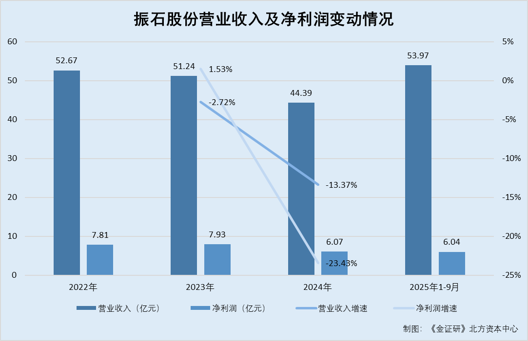 据振石股份签署于2025年11月19日的招股说明书(以下简称“签署于2025年11月19日的招股书”),2022-2024年及2025年1-6月,振石股份的营业收入分别为52.67亿元、51.24亿元、44.39亿元、32.75亿元,净利润分别为7.81亿元、7.93亿元、6.07亿元、4.04亿元。