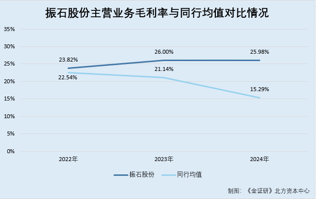 2022-2024年及2025年1-6月,振石股份的主营业务毛利率分别为23.82%、26%、25.98%、25.5%。同期,振石股份上述可比同行的主营业务毛利率均值分别为22.54%、21.14%、15.29%、17.91%。