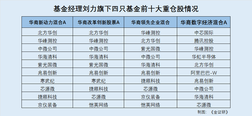 此外,刘力2023年1月接任的华商改革创新股票A与2025年1月接任的华商领先企业混合,截至2025年三季度末的前十大重仓股一致,分别为北方华创、华峰测控、中微公司、华海清科、紫光国微、兆易创新、寒武纪、捷顺科技、芯源微、恺英网络。