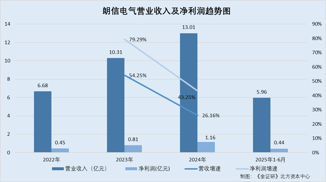 经《金证研》北方资本中心测算,2023-2024年,朗信电气营业收入同比增速分别为54.25%、26.16%,净利润增速分别为79.29%、43.25%。