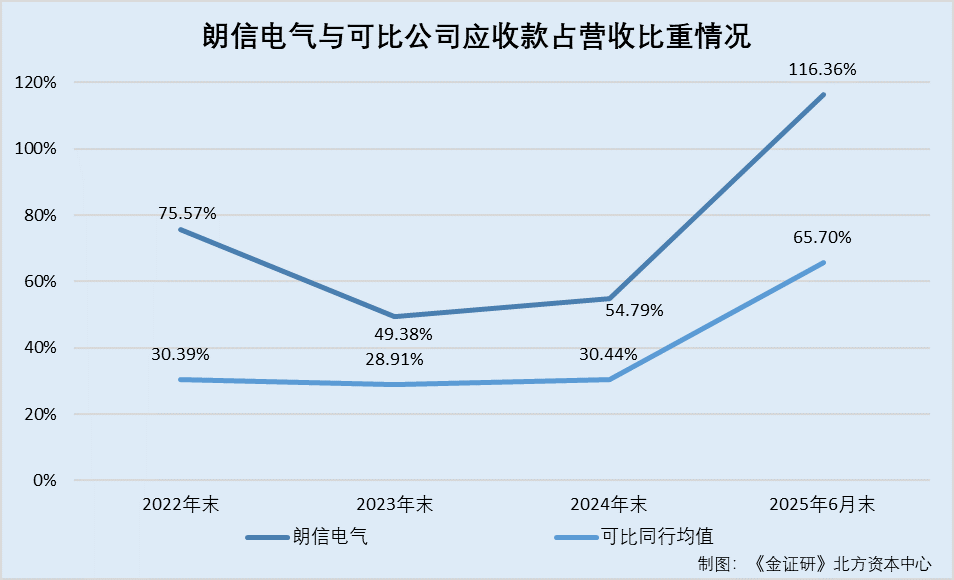经测算,2022-2024年及2025年1-6月各期末,朗信电气应收款占营业收入的比例分别为75.57%、49.38%、54.79%、116.36%。同期,朗信电气同行可比企业应收款占营业收入比例的均值分别为30.39%、28.91%、30.44%、65.7%。