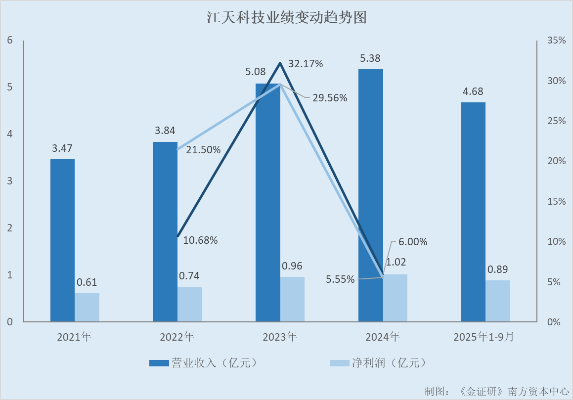 据江天科技签署日期为2024年12月25日的招股说明书(以下简称“2024年12月25日签署的招股书”)及签署日期为2025年12月3日的招股说明书(以下简称“2025年12月3日签署的招股书”),2021-2024年及2025年1-9月,江天科技的营业收入分别为3.47亿元、3.84亿元、5.08亿元、5.38亿元、3.05亿元,净利润分别为0.61亿元、0.74亿元、0.96亿元、1.02亿元、0.57亿元。