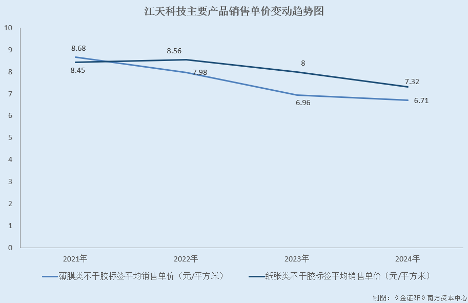 然而,2021-2024年及2025年1-6月,江天科技主要产品薄膜类不干胶标签的平均销售价格分别为8.68元/平方米、7.98元/平方米、6.96元/平方米、6.71元/平方米、5.84元/平方米。而同期,纸张类不干胶标签的平均销售单价分别为8.45元/平方米、8.56元/平方米、8元/平方米、7.32元/平方米、7.7元/平方米。