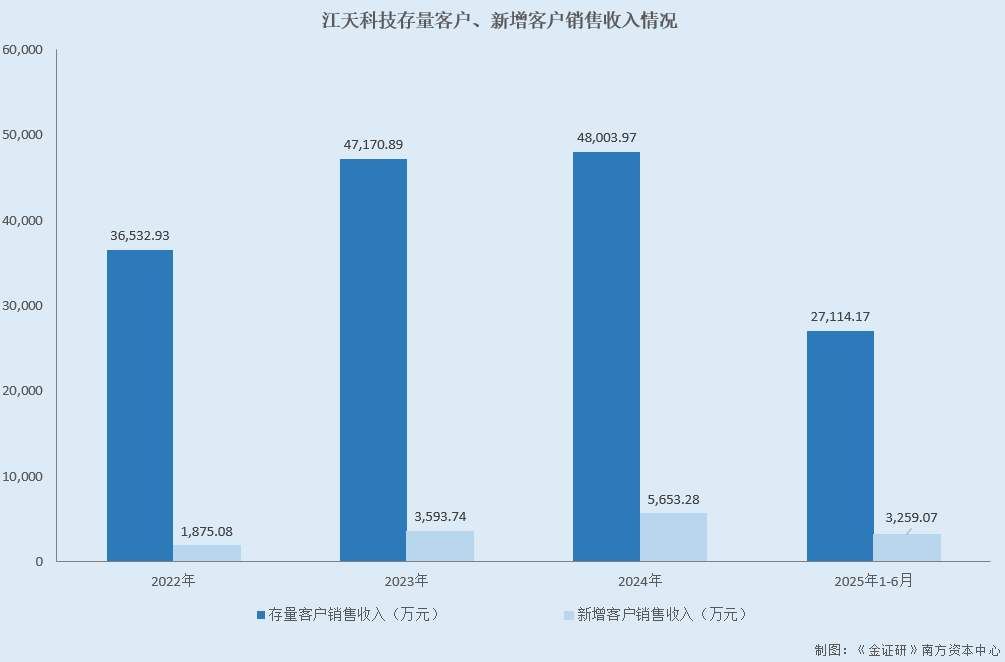 而据2025年10月23日签署的二轮问询回复,2022-2024年及2025年1-6月,江天科技存量客户销售收入分别为36,532.93万元、47,170.89万元、48,003.97万元、27,114.17万元,新增客户销售收入分别为1,875.08万元、3,593.74万元、5,653.28万元、3,259.07万元。
