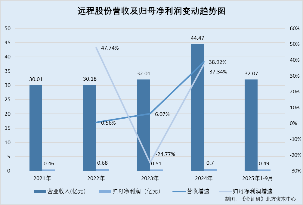 据远程股份2022-2024年年报,2021-2024年,远程股份的营业收入分别为30.01亿元、30.18亿元、32.01亿元、44.47亿元,归属于母公司股东的净利润(以下简称“归母净利润”)分别为4,599.62万元、6,795.7万元、5,112.47万元、7,021.34万元。