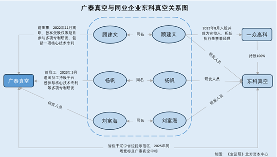 另一方面,2022年11月广泰真空原董事兼技术部部长顾建文离职,并退出员工持股平台。而顾建文曾参与广泰真空多项专利的发明,其中一项系核心技术专利。次年8月,同名顾建文入股并控制一家企业,且该企业的子公司出现包括顾建文在内的三名专利发明人,与广泰真空原参与多项专利研发的三名发明人“同名”,两者的部分专利涉及领域或存重叠。另外广泰真空及前述企业子公司皆位于相同地区,且2025年二者同场竞标。
