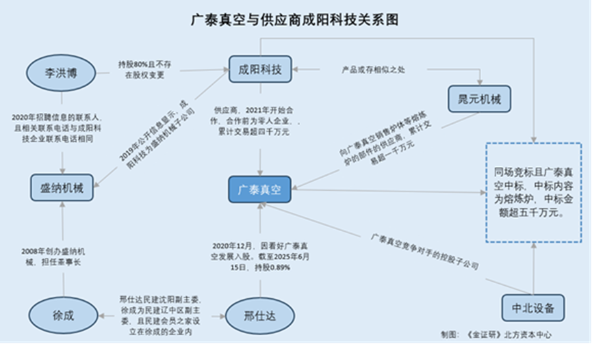 并且,成阳科技在公开平台上自称其为专业做炉体的企业,其产品与广泰真空供应商产品存相似之处。而炉体为广泰真空主要产品熔炼炉及烧结炉的部件之一。2025年,广泰真空与成阳科技同场竞标,且中标人为广泰真空。上述巧合背后,广泰真空与供应商成阳科技背后的“关系网”或值得关注。