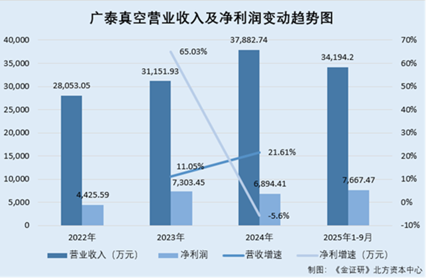 经测算,2023-2024年,广泰真空营收增速分别为11.05%、21.61%,净利润增速分别为65.03%、-5.6%。2025年1-9月,广泰真空的营收增速、净利增速分别为26.03%、27.95%。