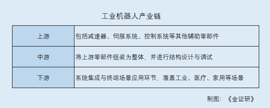 具体来看,工业机器人产业链分为上游零部件、中游本体制造、下游系统集成及应用三大环节。