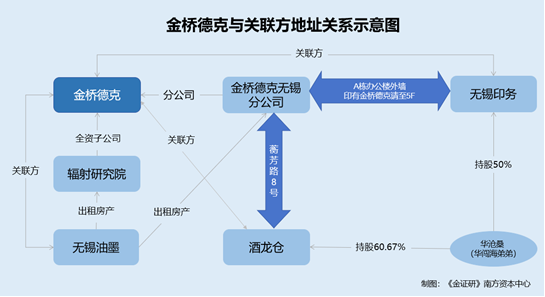即金桥德克及子公司辐射研究院,向华闯海等股东持股的无锡油墨租赁其位于蘅芳路88-6号的房产用以办公。无锡印务系华闯海弟弟华沧桑持股50%的企业,无锡印务的地址位于蘅芳路88-2号,且该地址所在大楼或为新桥工业园A栋。而该栋大楼外墙却印有“金桥德克请至5F”的字样。