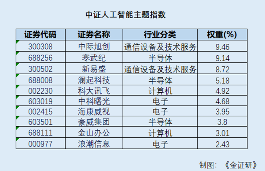 截至2026年1月13日,该指数前十大权重分别为中际旭创、寒武纪、新易盛、澜起科技、科大讯飞、中科曙光、海康威视、豪威集团、金山办公、浪潮信息,合计占比55.27%。