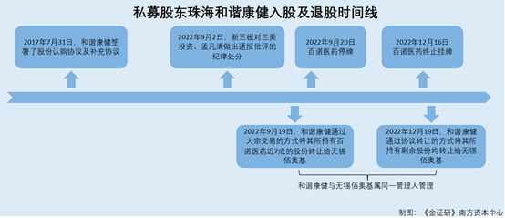 即是说,在百诺医药停牌前一天及终止挂牌后第三天,和谐康健将其所持有百诺医药的股份先后转让给无锡佰奥基,且已退出百诺医药。