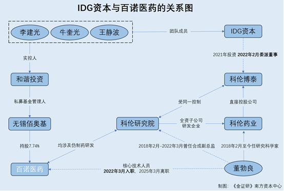 另一方面,百诺医药核心技术人员董勃良于此次申报辅导前夕“突击”离职背后,董勃良的老东家科伦研究院,不仅与IDG资本曾投资的科伦博泰系同一控制下企业,且科伦研究院业务或与百诺医药存重叠。而需要指出的是,百诺医药股东无锡佰奥基,与和谐康健系同一管理人即和谐投资管理下的基金,该基金管理人和谐投资系由IDG资本的团队成员控制。且基于上述情形,关于原核心技术人员董勃良与私募股东背后的“关系网”或值得关注。