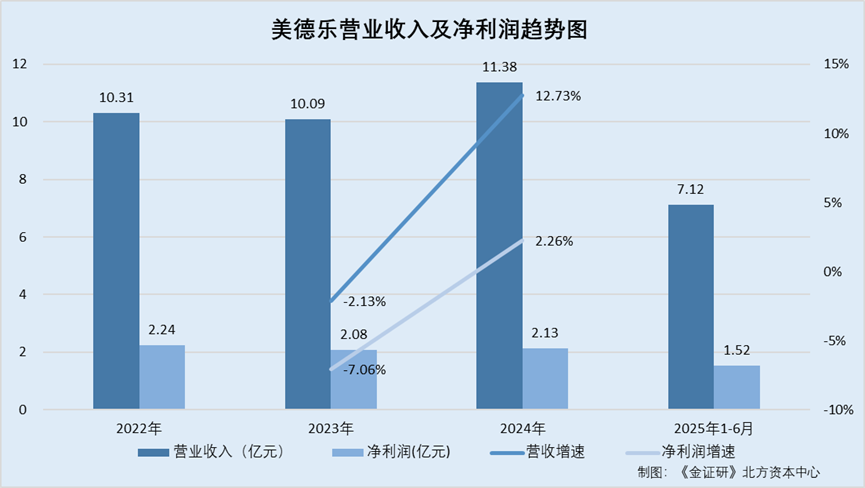 据美德乐签署于2025年11月14日的招股说明书(以下简称“签署于2025年11月14日的招股书”),2022-2024年,美德乐的营业收入分别为10.31亿元、10.09亿元、11.38亿元;同期,美德乐的净利润分别为2.24亿元、2.08亿元、2.13亿元。