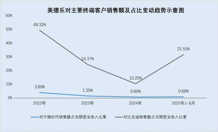据2025年11月28日招股书,2022-2024年及2025年1-6月,主要终端客户比亚迪分别系美德乐第一大、第一大、第二大、第一大客户,美德乐对其销售额分别为5.09亿元、2.46亿元、1.17亿元、2.25亿元,占主营业务收入比重分别为49.32%、24.37%、10.25%、31.55%。