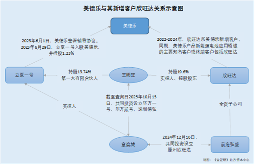 在此背景下,2023年6月1日,美德乐签署上市辅导协议,同月,立夏一号入股美德乐并持股1.23%。而立夏一号的第一大有限合伙人王明旺,或系上市企业欣旺达的实控人兼控股股东。而报告期内即2022-2024年,欣旺达成为美德乐的新增客户。