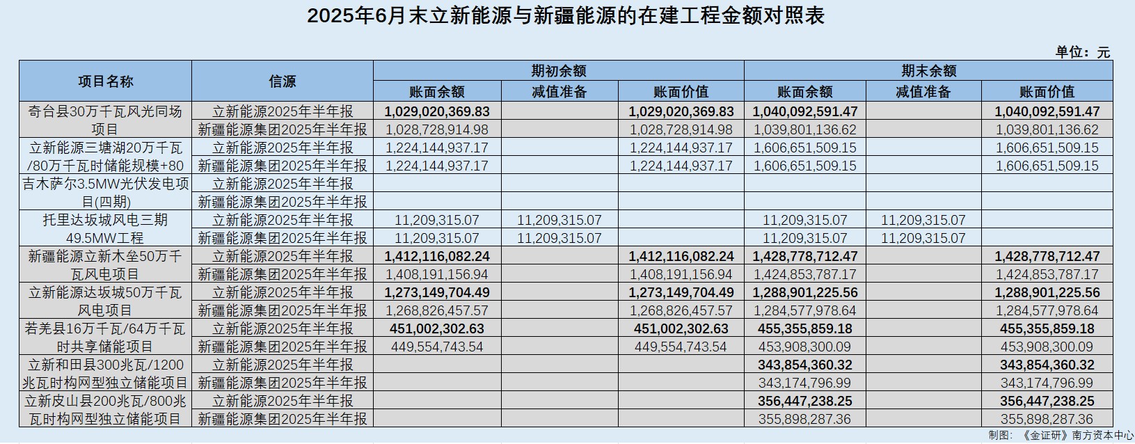 不仅如此,《金证研》南方资本中心研究发现,立新能源与新疆能源集团2025年半年报中,双方除“零星工程”外披露了9个同名项目。其中,3个项目的期初、期末的账面余额、减值准备、账面价值均一致;而6个项目的期初及期末的账面余额、减值准备、账面价值均存在差异,且立新能源的披露值大于新疆能源集团的披露值。