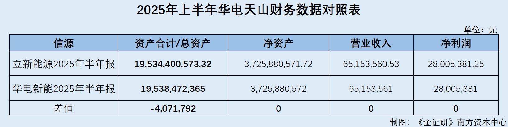 经计算,就华电天山2025年上半年的数据来看,立新能源2025年半年报所披露的华电天山的净资产、营业收入、净利润,均与华电新能2025年半年报的披露值一致;而立新能源披露的华电天山资产合计,高出华电新能披露的总资产407.18万元。