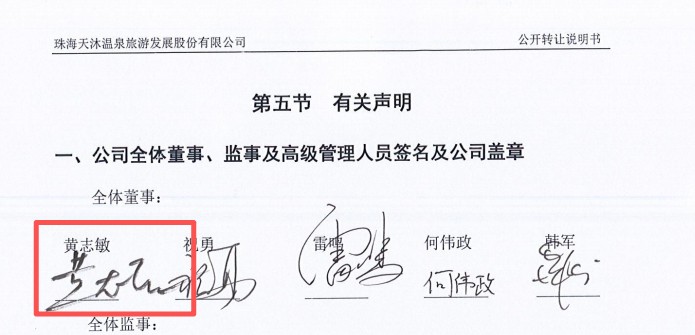 而据天沐温泉公告,2015年6月16日,黄志敏在天沐温泉的公司章程中签字。2015年11月12日,黄志敏在天沐温泉的公开转让说明书中签字。