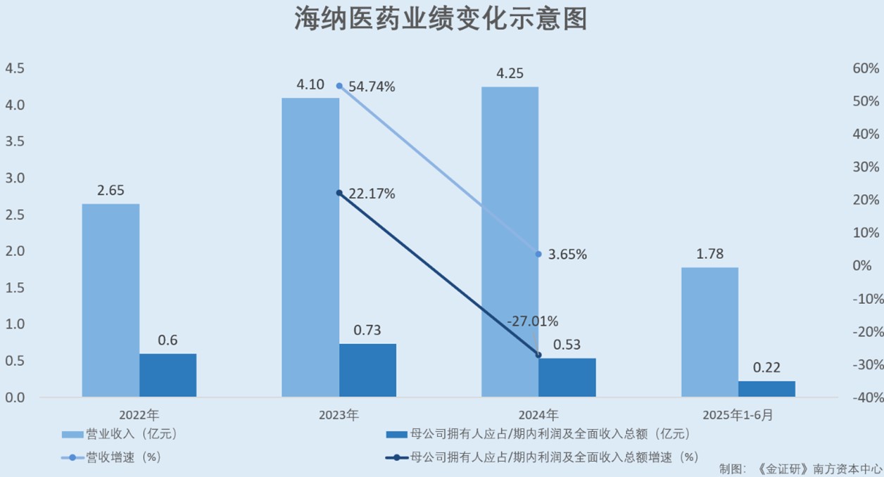 2023-2024年及2025年上半年,海纳医药的营业收入增速分别为54.74%、3.65%、-16.97%;同期,海纳医药母公司的拥有人应占/期内利润及全面收入总额增速分别为22.17%、-27.01%、-25.82%。