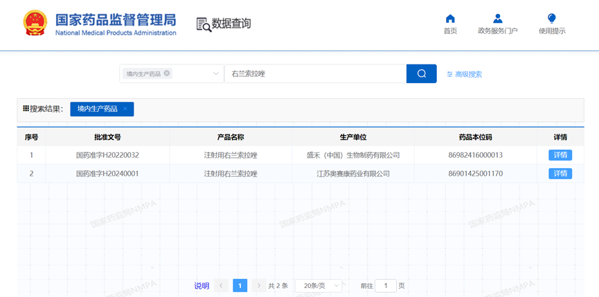 据国家药品监督管理局数据,截至查询日2026年1月28日,通过药品名关键词“右兰索拉唑”搜索,查询到的结果共有2个关于“注射用右兰索拉唑”的注册信息。
