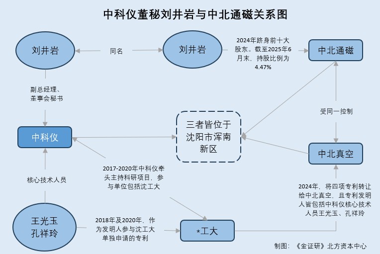 简言之,刘井岩系国资控股企业中科仪的副总经理兼董秘。2024年末及2025年上半年末,同名“刘井岩”为新三板企业中北通磁第八大股东,且中北通磁与中北真空皆受孙宝玉控制。另一方面,2018年及2020年,中科仪两名核心技术人员或现身中科仪合作研发方*工大单独申请的专利的发明人名单。2024年,*工大将四项单独申请的专利转让给中北真空,且前述专利的发明人或包括中科仪的两名核心技术人员。