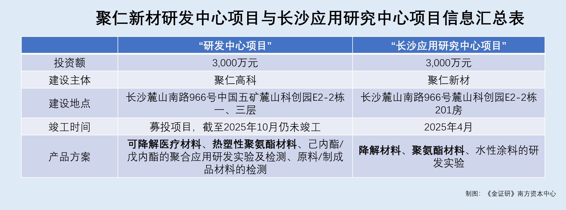 此外,聚仁新材拟募资2,700万元用于建设“研发中心项目”,其被要求说明合理性。对此,聚仁新材称,目前其仍未设立独立的研发中心。然而,2025年4月,聚仁新材的“长沙研究中心项目”已竣工。且募投项目“研发中心项目”与“长沙研究中心项目”位于同一栋大楼,两个项目的研发方案或均包括对降解材料、聚氨酯材料的研发实验。
