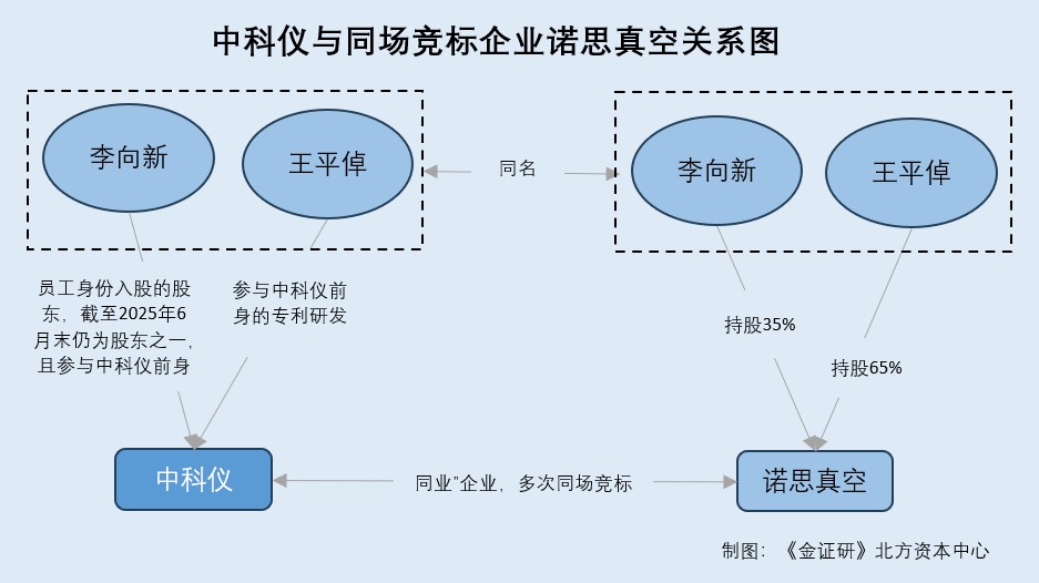 回溯历史,中科仪设立时,李向新和慈连鳌曾以职工身份入股。截至2025年6月末,李向新和慈连鳌仍持有中科仪股份。研究发现,李向新、王平倬曾为中科仪前身研发专利。而同名的“李向新”、“王平倬”合计对诺思真空持股100%,诺思真空部分产品与中科仪或存重叠。不仅如此,2024-2025年,中科仪与诺思真空曾多次进行同场竞标。