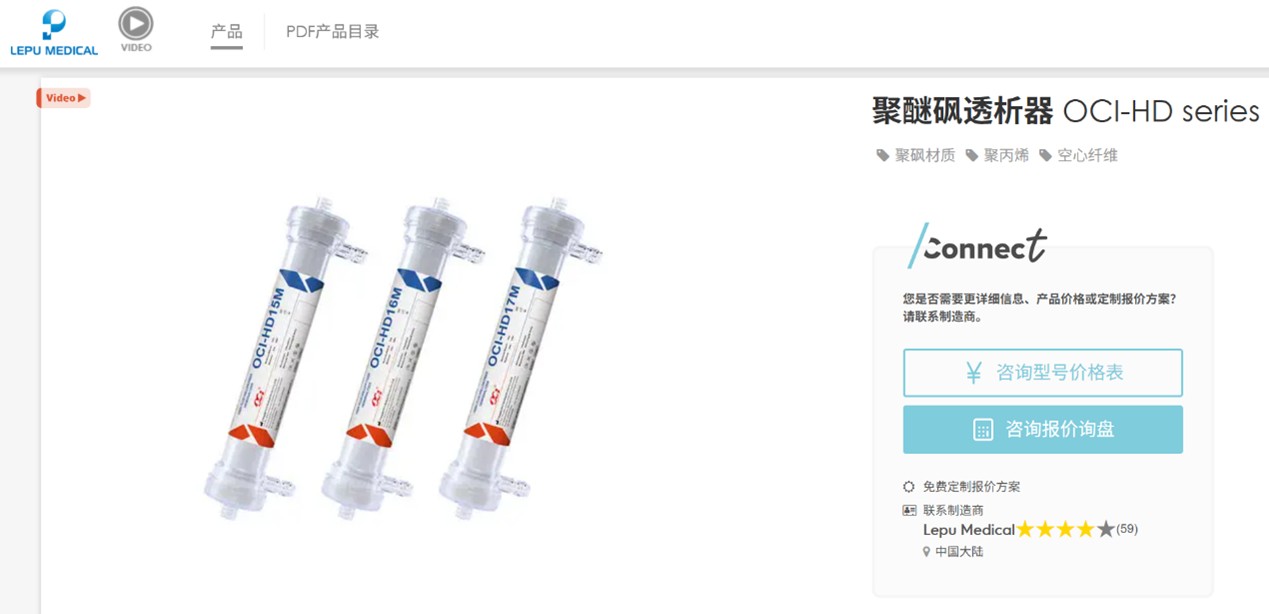不仅如此,截至查询日2026年2月9日,MedicalExpo列示的聚醚砜透析器、血液过滤器等产品,其联系制造商显示为乐普医疗。