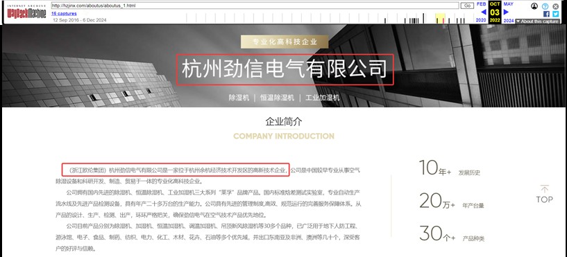 而据Internet archive回溯劲信电器官网2022年10月3日的信息,劲信电气的企业简介显示,浙江欧伦集团(杭州劲信电气有限公司),是一家位于杭州余杭经济技术开发区的高新技术企业。
