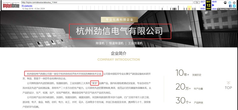此外,据Internet archive回溯劲信电气官网2023年5月12日的信息,劲信电气简介内容,并无“浙江欧伦集团”的内容,显示为“杭州劲信电气有限公司”的公司名称。