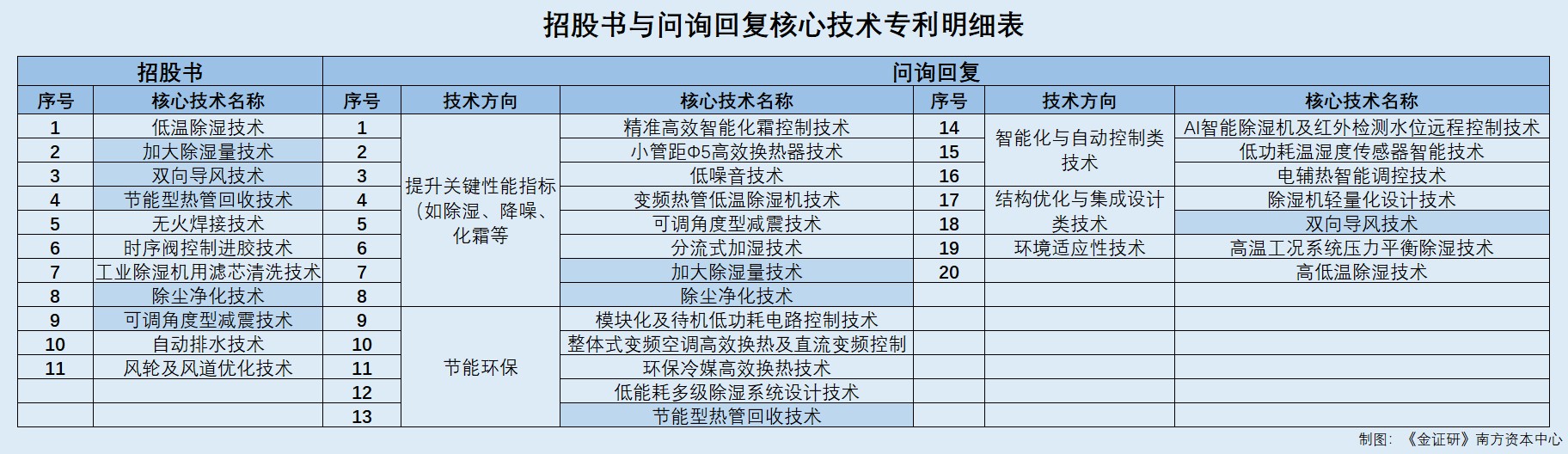 然而,对比发现,首轮问询回复提及的20项核心技术中,加大除湿量技术、双向导风技术、节能型热管热回收技术、除尘净化技术、可调角度型减震技术5项核心技术,与欧伦电气在招股书中认定的核心技术名称一致。
